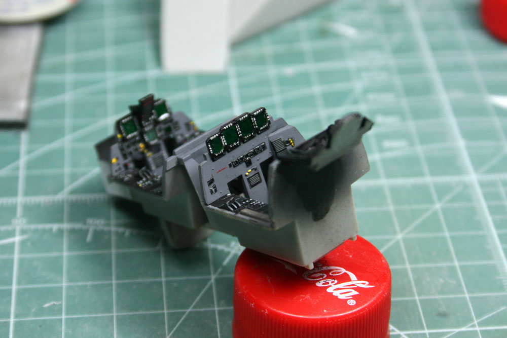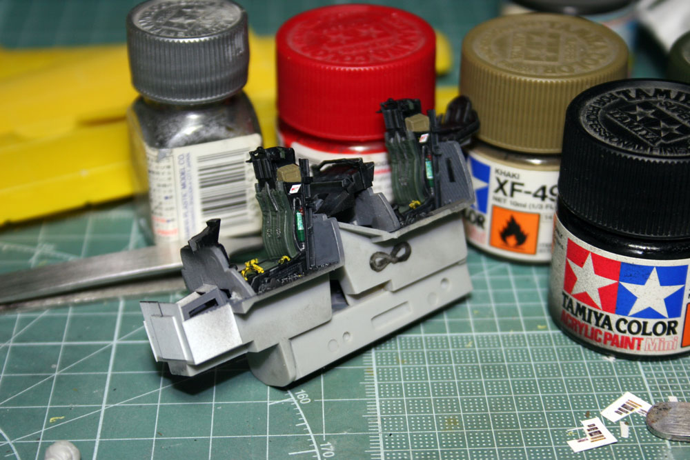 Detaylar fyrçayla boyandy; knoblar açyk gri, bir kysym kyrmyzy ve ye?il dü?meler, sary dü?meler kollar vs. MFD'lerin içi RLM 70 üstü transparan ye?il, üstüne Testors Clear Cement;