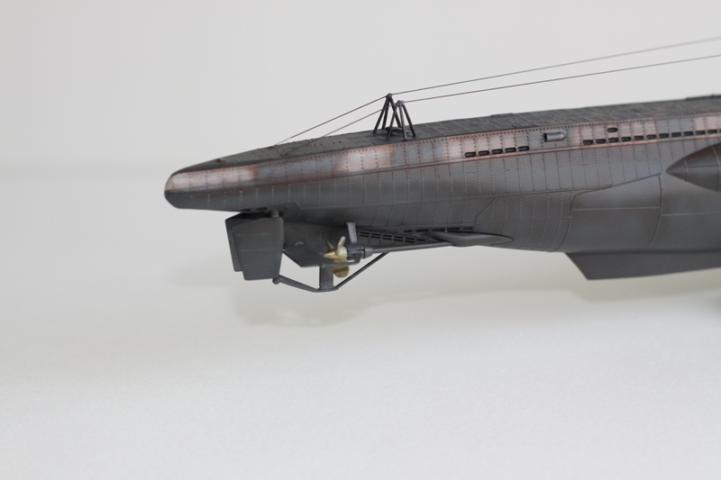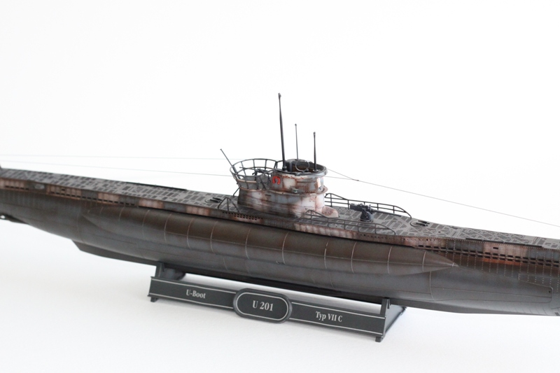 Modelin montajı son derece sorunsuzdu. Sadece korkuluklardaki kalıp artıklarını temizlemek bir hayli zaman aldı çünkü küçük ve ince olduklarından kolaylıkla kırılabilirlerdi. Modelin montajını tamamladıktan sonra U-201 olarak bitirmeye karar verdim,kamuflajlı olması tercih sebebim. Kamuflajı serbest el attıktan sonra gövde yıkandı ve Tamiya kahverengi kullanarak paslandırmayı yaptım. Fırça ile sürdüğüm boyanın üstünden airbrushla tekrar geçtim. İlk pas denemem haliyle abartılı olmasını sağladı. İşin ilginç yanı U-201 bu kadar paslanabilcek ömrü olmadı,çok çabuk batırıldı. Son olarak mat vernik atıldı ve ince misinadan telleri çekildi.