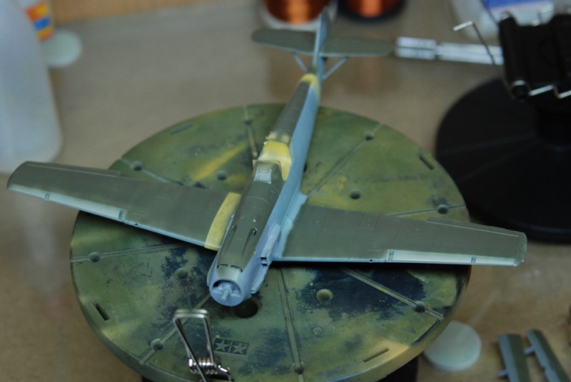 Kokpit toparlandiktan sonra gövdeyi birlestirip kanatlari taktim. Kitin birlesimi neredeyse kusursuz. Gövdenin kuyruga dogru uzanan sirt ve alt kisimlarinda Bf 109lara özgü birlesme hattinin kalmasi için biraz ayarlama yapmak gerekti. Ayri boyanacak pervane, teker gibi parçalari ve Tamiya'nin ayri verdigi flaplari da hazirlayarak boyamaya giristim. Boyamada genelde Gunze'nin akrilik Luftwaffe renklerini kullandim. Öncelikle kuyruktaki beyaz tanitma bandini boyayarak maskeledim. Sonrasinda ise planlama yapmak gerekti. Zira uçak standart kamuflaja sahipken Afrika'ya gönderildikten sonra RLM 70 yesili ve RLM 02 grisi ile mevcut boyanin üstünde yeni yerler boyanmis, eski gövde isaretleri gelisigüzel kamuflajla kapatilmisti. Ben de açik renkten koyu renge dogru gitmeye ve gerçegindeki gibi sonradan boyanan kisimlari uçagin standart kamuflajini yaptiktan sonra halletmeye karar verdim. Böylece ilk olarak uçagin tamami RLM 65 rengiyle boyandi. Ardindan maskeleme ile gövde ve kanat üstü RLM 71'e boyanip maskelemeyle RLM 70 uygulandi. Son olarak uçaga sonradan atilan RLM 02 ve RLM 70 boyamalari yapildi. Cutting Edge'in plani renkli ve neredeyse ölçegi tutuyor, bu açidan oldukça yardimci oluyor. Ancak uçagin sag tarafiyla ilgili bilgi vermemisler. Yaptigim arastirmalar sonucu nedenini anladim, uçagin sag tarafinin bir fotografi bulunmuyor. Varsa da henüz ortaya çikmamis. Bu sebeple bu tarafi boyarken yabancilarin "artistic license" olarak tabir ettigi "yaratici mabad gücü"mü kullandim. Yanlis yaptigimi öne sürebileceklere "Daha önceleeriiii neredeydiniiiz" seklindeki sarkiyi hediye ediyorum.
