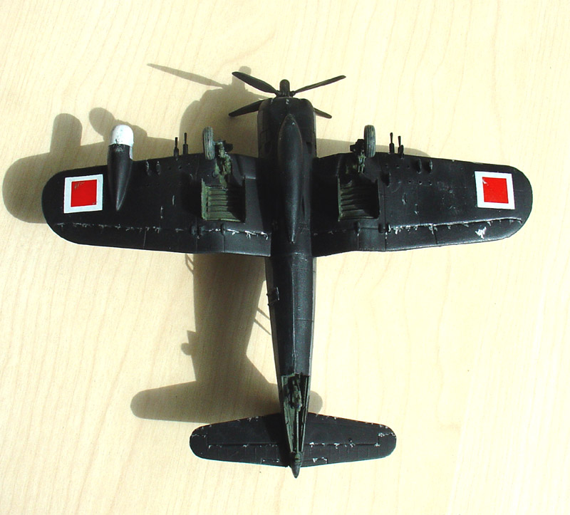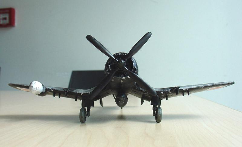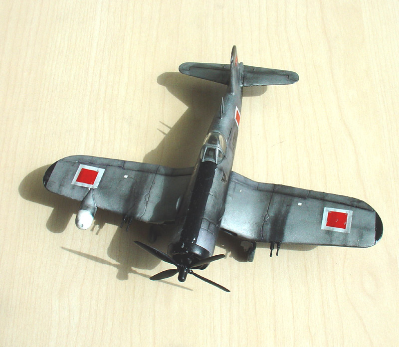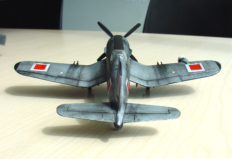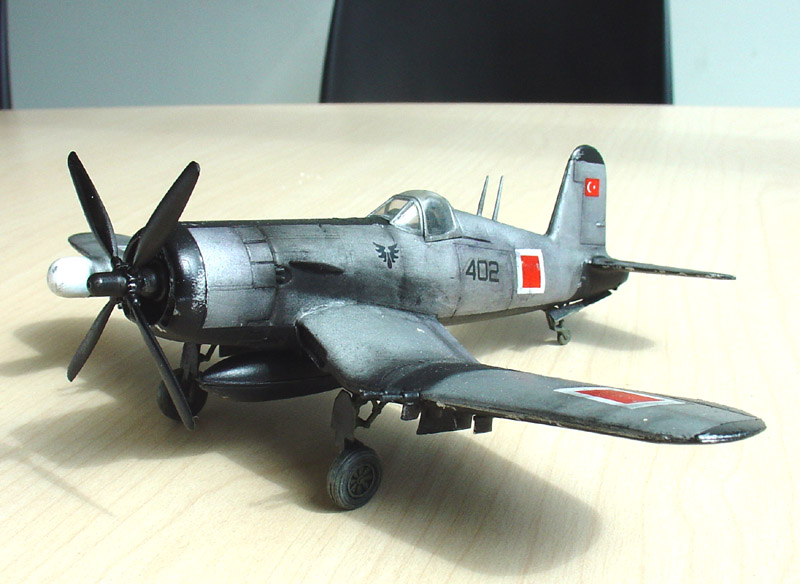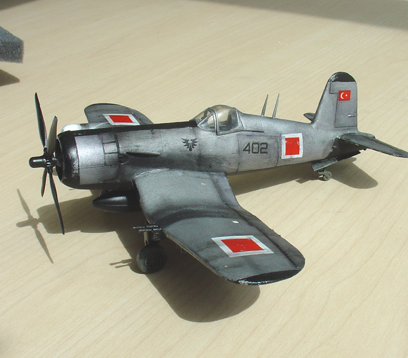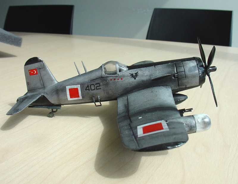 uzayıp bizim hava gücümüzün U.S.N. envanterinden çıkarılan eski gece avcısı Corsairlar ile teçhiz edilip gece görevlerinde Birleşmiş Milletler pilotlarının ağzını bir karış açık bırakması üzerine (Uçak gemimiz yok, biliyorum). Bize geldikleri sırada bir iki ufak değişiklik yapılıp üst taraf çıplak metal alt taraf siyah olarak uçmaya başladılar(mı?). Kit genel olarak oturma vs sorunu olmayan, uslu uslu birleşen ufak ve güzel bir model. Dekallere gelince: Uyarı işaretleri vs gibi uçağın kendisinde olan dekalleri kiten çıkanlardan kullandım. Türk forsları PM'in AT-11 kitinden. Kill Marks yine kitin kendisinden. Numaralar(tamamen uydurma tabii ki tahmin edebileceğiniz gibi) Matchbox'dan. Biraz baharatlandırmak için Games Workshop'un Blood Angels dekallerinden ufak bir filo arması uydurdum. Havacılık meraklıları beni affetsin:}