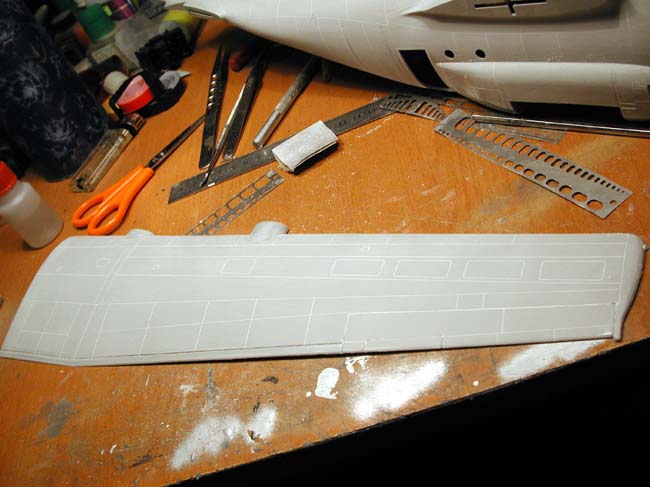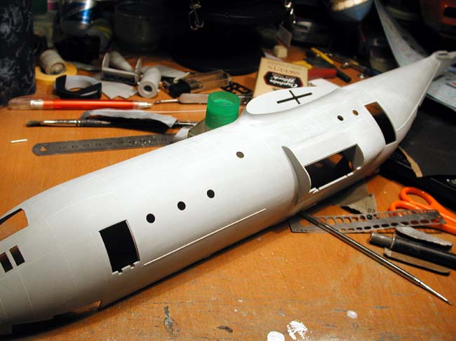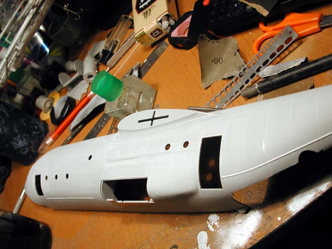 İnce styrenden gövdedeki güçlendirme bantlarını imal edip uçağın içinin yapımına geçtim. yarım günde komple iç aksamı toplayıp gövdeyi kapamaya koyuldum. İç aksamın kendi içinde burulması, haliyle gövdeye oturmaması vesaire derken bir gün kaybettim. Macun kuruma süresiyle ve putty problemlerini minimuma indirmek için kanat gövde birleşimlerine kendi standartlarıma göre oldukça fazla özen gösterdim. Bu sayede macun kullanım alanım kanopi kısmıyla sınırlandı.Ön camın eğiminin yüzeyle uyum göstermemesi küçük çaplı bir heykeltraşlıkla çözümlendikten sonra saydam parçaların tamamını maskeleyip yüzeye Tamiya sprey beyaz astar attım; kendisi sayın Osman özonur'un tavsiyesi olup yarışmaya anca 1 gün kala bu aşamaya gelebilen modelde hayat kurtarıcı rolü üstlendi.