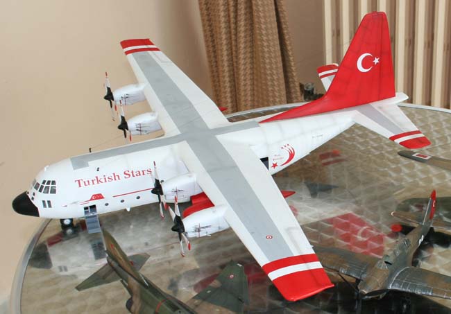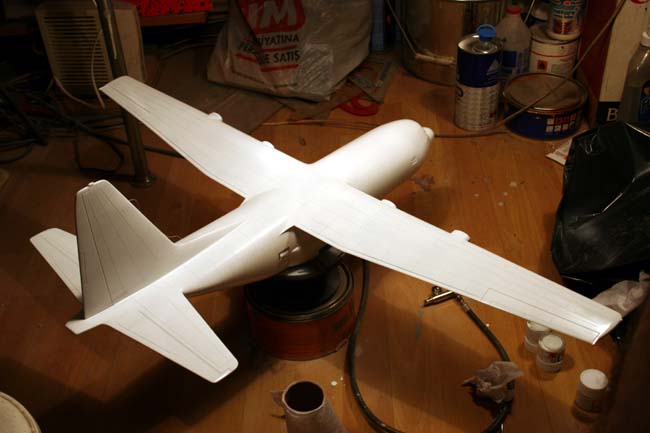 Çok uzun süredir yapmak istediğim bir modeldi, yaparsın yapamazsın gazıyla Hava Müze Komutanlığı plastik model uçak yarışmasına 3 hafta kala yapmaya karar verdim. Piyasada pek bulunmayan bir kit olan İtaleri 1/48 C-130 şansıma Tahir Efe'den çıktı. Modeli bulup alıncaya kadar geçen 2-3 günlük süreci elimdeki referanslar dahilinde gerekli dekalleri çizmekle ve fii tarihinde aynı kkite sahip olan biri olarak kafamda yapım aşamasını düzenlemekle değerlendirdim. Kitin elime geçmesiyle beraber kafamda oluşturduğum şablon dahilinde olaya giriştim, keza süre 2 haftaya düşmüş ve detaylara takılıp zaman kaybetme, yanlış yöntem izleyip iki defa iş yapma lüksüm kalmamıştı. İlk hamlede gövdenin ön ve arka yarılarını yapıştırıp ana gövdeyi sağ ve sol iki parça halinde yapışacak hale getirdim. Akabinde çelik cetvel, marka bandı ve tritool templateler yardımıyla bütün ana parçaları içeri detaya çevirdim. Bu işlem sonunda gövde 220 ve 400 numara aralığında zımpara yedi ve plastik çöküntüler vs puttylenip son kat zımpara atıldı.