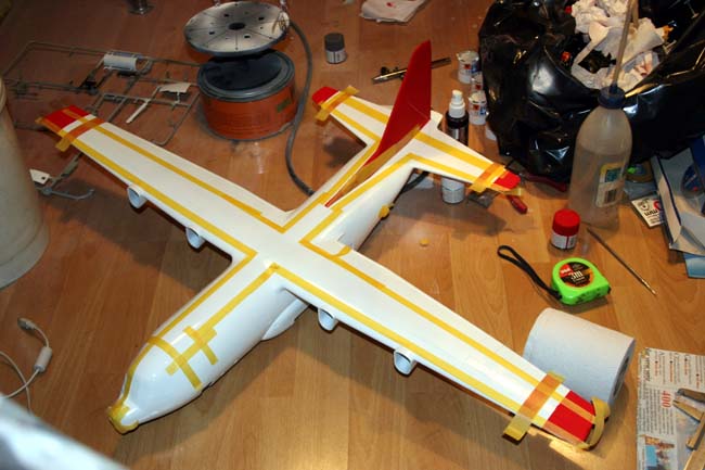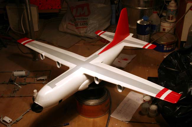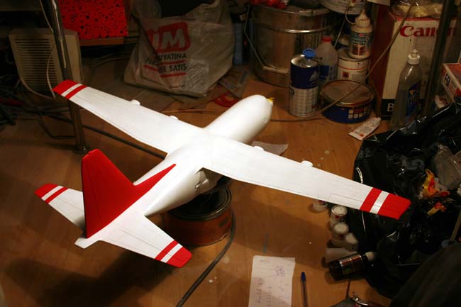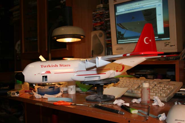 Herşey tamamdır dediğim an masanın üstüne modeli çevirirken kanada aldığı bir darbe, kanatların, iki kanat boyunca metal boruya rağmen bel verip, dikey stabın önünden kanopiye kadarki hattın çatlamasına yol açtı; yarım saat kadar sakinleşmeyi bekleyip ne yapacağımı düşündüm. Ya uyuyacaktım yada aleti tamir edecektim. Zor olanı seçip modeli tamir etmeye sabah 5 sularında karar verdim. Kalın akışkanlı japonu hat boyunca yarığa doldurduktan sonra iki kanat ucundan iki masa arsına dengede bıraktım modeli, böylelikle gövdeyi yukarıya kastıran kanatlar bu iki yüzeyin doğal olarak preslenmesini sağladı. Jiletle hattın üstünü temizleyip çok ince bir kat macun çektim. Macun kurumaya yakınken bir jilet operasyonu daha yaptım. Kısa süre sonra yüzeyi 1200 numara zımparayla düzeltip hat boyunca ince bir kat gri attım. İlk kullandığım gri karışım olduğu için haliyle attığım ikinci kat tonu tutmadı, bende hatta attığım boyayı bütün gri yürüme alanlarına yama şeklinde uyguladım. Saat 7 itibariyle model bitmiş ve buruna yerleştirdigim ağırlıkların az geldiği gerçeğiyle karşılaşmıştım. Acil olarak 3 tamiya boya kutusu alıp içlerine su doldurdum, kapaklarını kapayıp birleşim noktalarına japon döndüm. Bu 3 kutuyu birbirine yapıştırıp etrafını siyah folyoyla kapadım. pistolede kalan griylede bu konstruksiyona gölge verdikten sonra kutuların altına japon sürüp arka kargo kapağından uçağın önüne doğru salladım, sonuçta kargo uçağıysa içinde ne taşıdığı kendini ilgilendirir :)