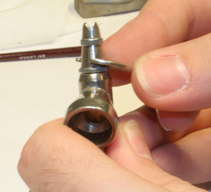 İğneyi geriye doğru çekip çıkarın.Tetiği yukarı doğru alın, arkasındaki eğimli baskı parçasını cımbız yardımıyla çevirip dışarıya alın. Böylece haznenin arkasındaki bütün aksamı sökmüş bulunuyorsunuz. Şu ana kadar sökülen bütün parçaları tinere yatırabilirsiniz (üstlerinde boya çözülünceye kadar, çok fazla bırakmayın tinerde)