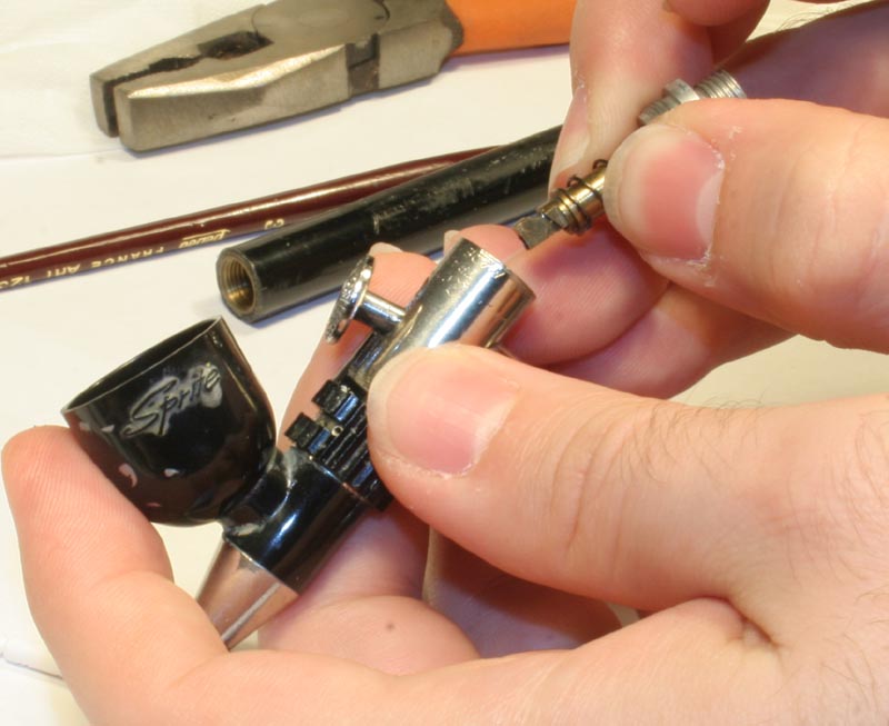 Tetiği 90 derece çevirerek yukarı doğru alın. Mevcut boşluktan aşağıya bakıp boya artığı varsa temizleyin. Bu merkenz parçayı kesinlikle selulozik tinere yatırmayın keza havanın akışını sağlayan alttaki diyafram çok ince bir lastikten mamul olduğu için tiner bir süre sonra bu lastiğin kurumasına ve akabinde yırtılmasına sebebiyet vermektedir.